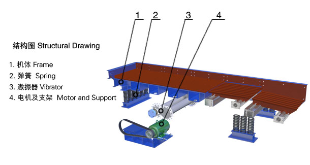 ZSW系列振動給料機是由給料槽體、激振器、彈簧支座、傳動裝置等組成。槽體振動給料的振動源是激振器,激振器是由兩根偏心軸(主、被動)和齒輪副組成,由電動機通過三角帶驅動主動軸,再由主動軸上齒輪嚙合被動軸轉動,主、被動軸同時反向旋轉,槽體振動,使物料連續不斷流動,達到輸送物料的目的。